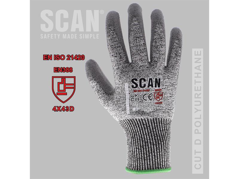 Scan Safety Cut D Gloves have polyurethane coated palms and fingers making them suitable for general handling of most materials, warehouse applications and much more. The Cut D liner makes these gloves highly cut and tear resistant. Ideal for work where blades and other sharp objects are present. 16% of the liner is made from recycled polyester, reducing the use of virgin plastics in manufacturing.