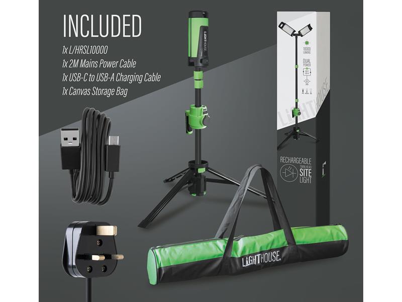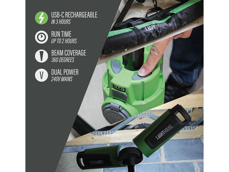 The Lighthouse Rechargeable Site Light is your ultimate lighting solution for any workspace This powerful work light boasts an impressive 10000-lumen brightness (Mains Powered) and 5000-lumen (Battery) ensuring you have ample illumination for any task. With three adjustable lighting modes, you can easily customise the brightness to suit your needs.
