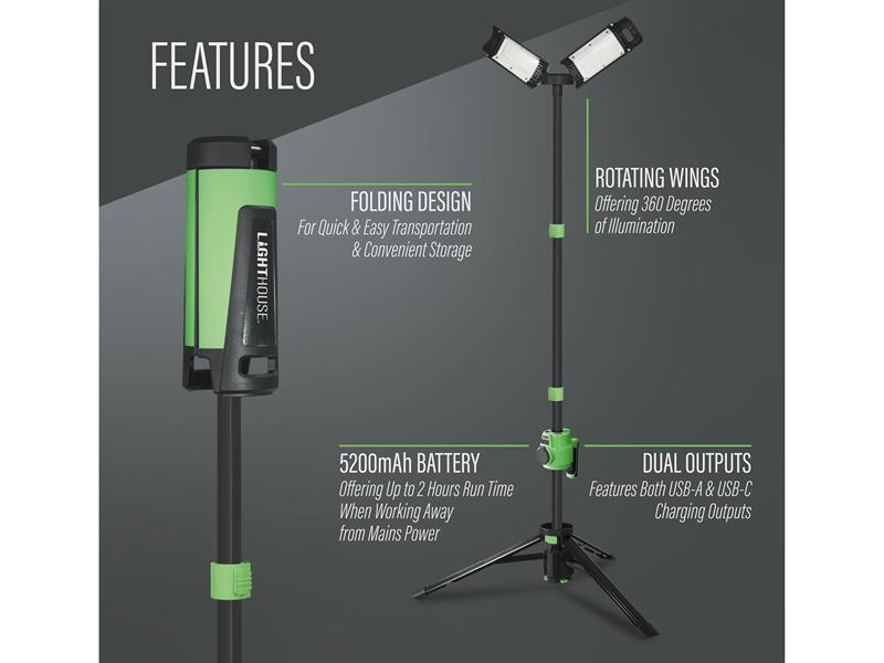 Equipped with a 5200mAh internal battery, the Lighthouse Work Light offers up to 2 hours of continuous run time when working away from mains power or when power is unavailable. Its 6500K colour temperature provides a bright, daylight-like quality, perfect for detailed work. The light is also lightweight and foldable, and it features rotational wing light heads making it incredibly versatile and fit for any application.