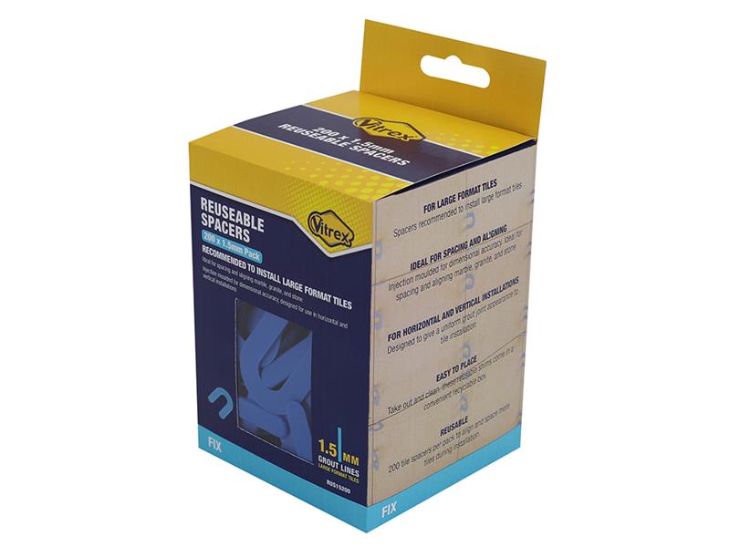 Vitrex Reusable Tile Spacers are perfect for achieving precise 1.5mm grout lines when installing large-format tiles, marble, granite, or stone. Injection moulded for dimensional accuracy, they ensure a clean, uniform finish in both horizontal and vertical applications. Each pack includes 200 durable spacers that are easy to place, remove, and clean, making them ideal for reuse across multiple projects. Designed to help you align and space tiles efficiently, these spacers come in a convenient, recyclable storage box. They’re the smart choice for professional results with less waste.