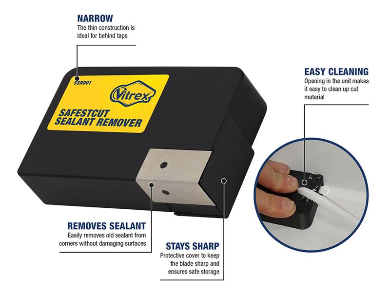 The Vitrex SAFESTCUT Sealant Remover is the ultimate tool for effortlessly removing sealant without risking damage to your surfaces. Equipped with a protective blade cover, allowing for safe storage when not in use. It’s ergonomic design makes it perfect for accessing those hard-to-reach places, such as behind taps and around intricate fittings, where sealant tends to accumulate.