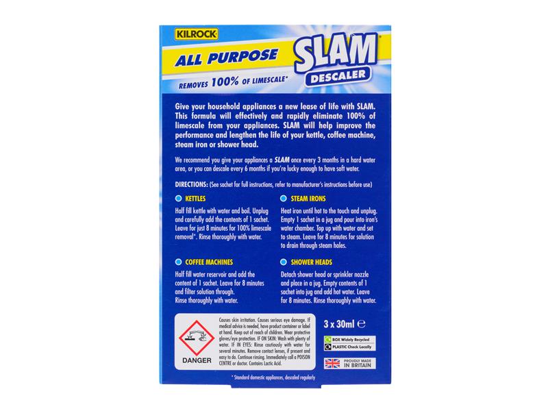SLAM All Purpose Descaler removes 100% of limescale from your appliances. SLAM will help improve the performance and lengthen the life of your kettle, coffee machine, steam iron or shower head.