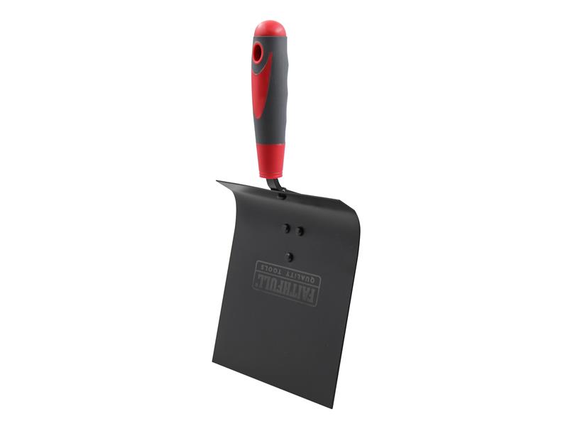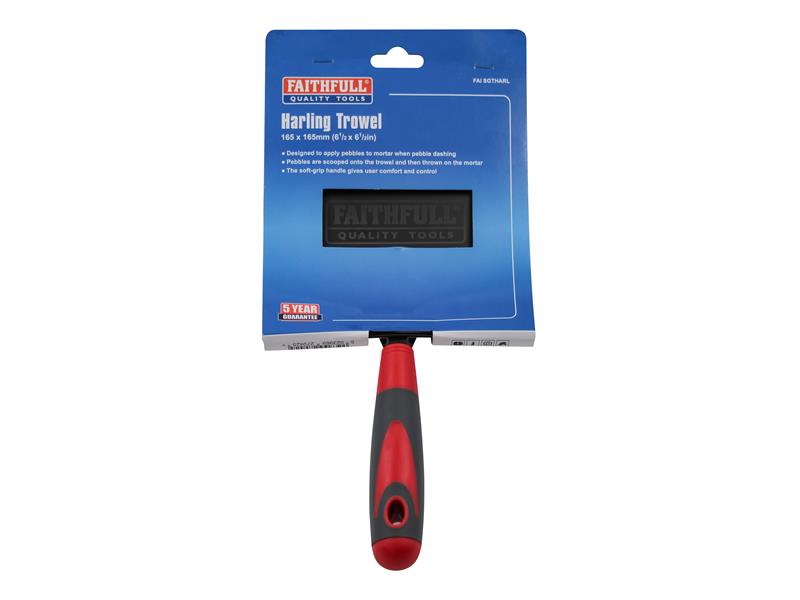 Faithfull Harling trowel with a soft-grip handle. Designed to apply pebbles to mortar when pebble dashing. Pebbles are scooped onto the trowel and then thrown on the mortar. The soft grip handle provides user comfort and control.