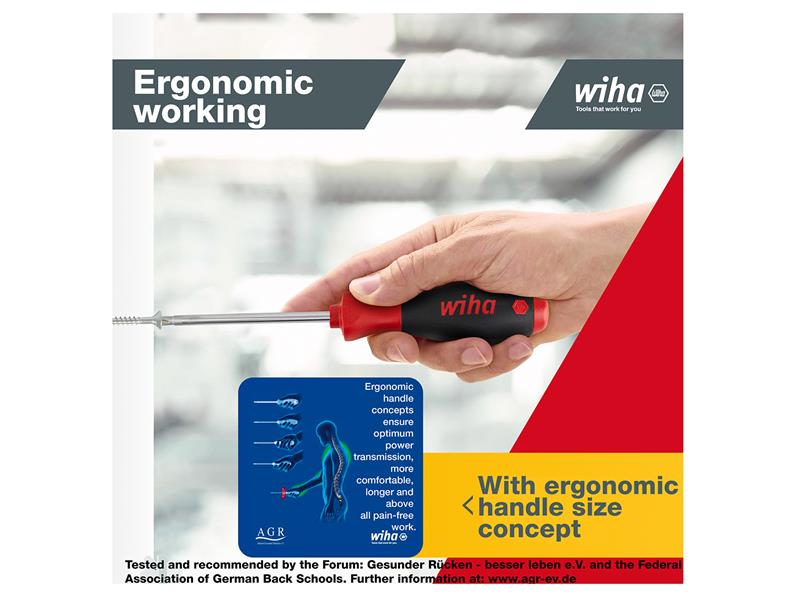 The Wiha SoftFinish® TORX® Screwdrivers come with a round Chrome vanadium steel blade, matt chrome plated. A patented SoftFinish® handle ensures work is kind to hands and muscles. Recommended by doctors and therapists at German Campaign for Healthier Backs. The unique Wiha handle-length concept provides optimum balance of torque and control.