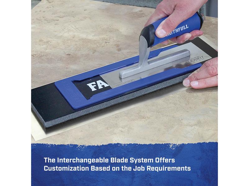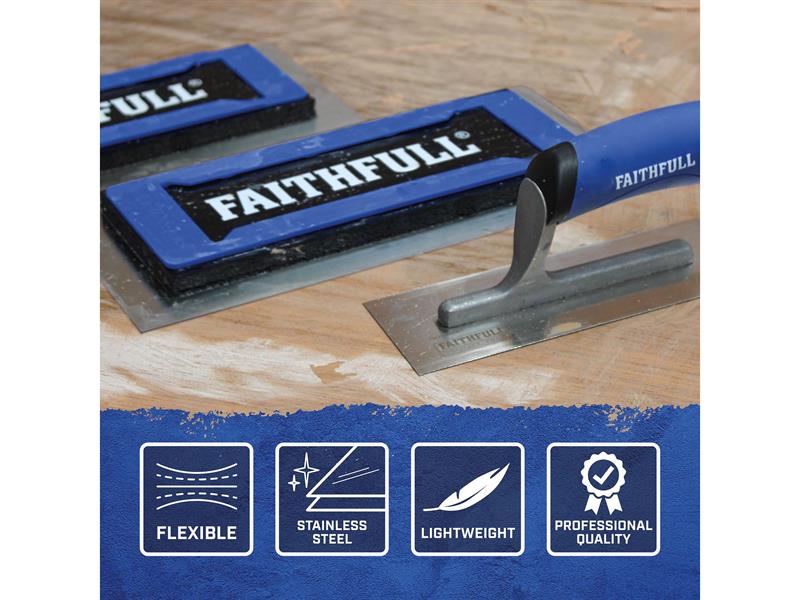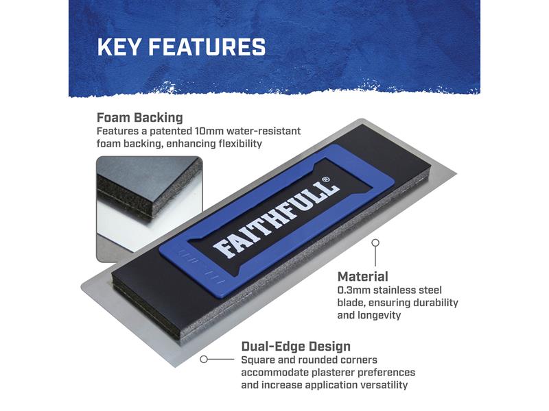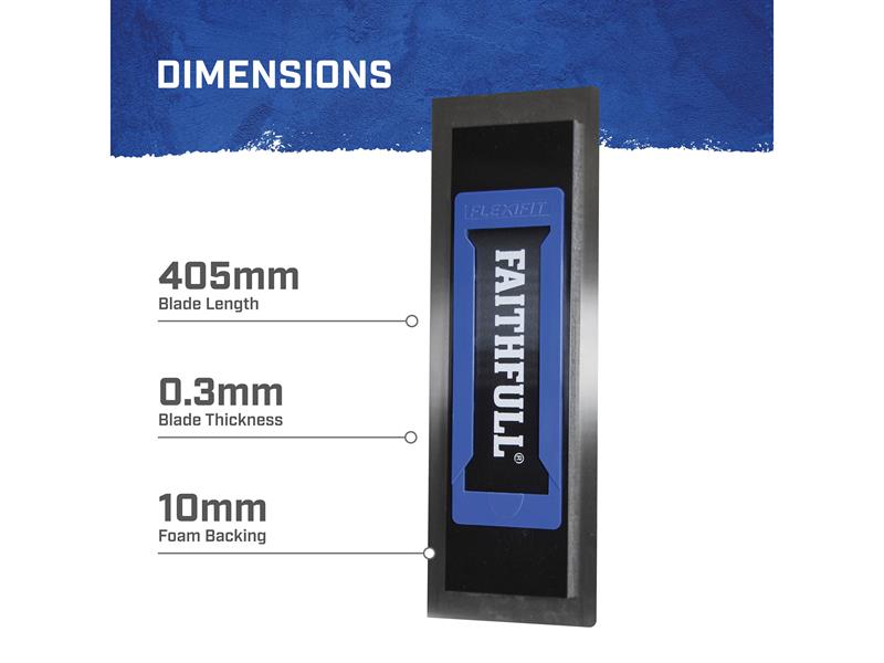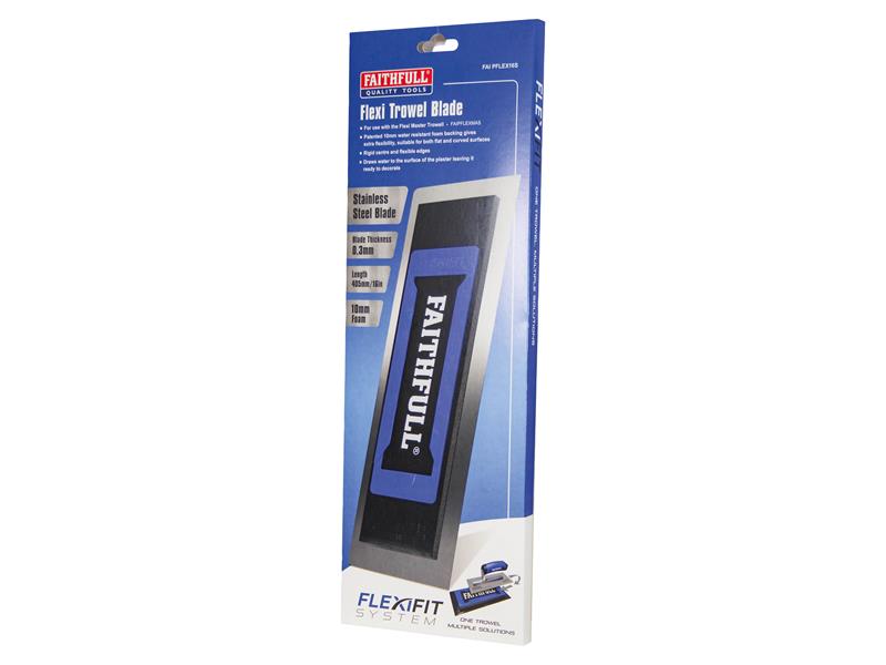 This range of Faithfull Flexi Blades are designed for use in conjunction with the FAIPFLEXMAS Flexi Master Trowel. They are the only metal interchangeable blades available that are supplied moulded to a unique 10mm foam backing. This drastically increases the blades flexibility when in use compared to a fixed handle flexible trowel.