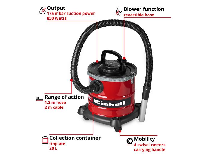 The Einhell TC-AV 2032 DW Ash Vac knows no limits when it comes to household applications. Whether cooled ash has to be disposed of from your fireplace or wood burner or the resident grill master is having a spring clean, the suction cup with its 20 litre large collecting container also allows you to work for longer.