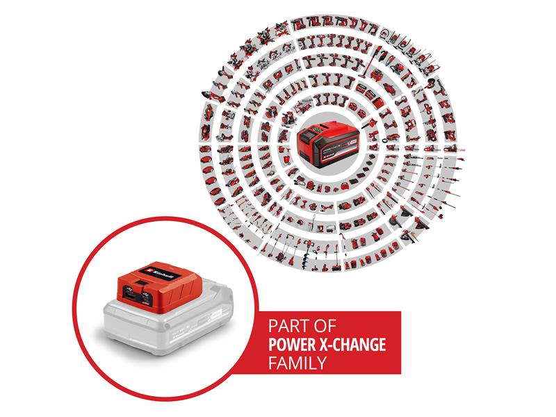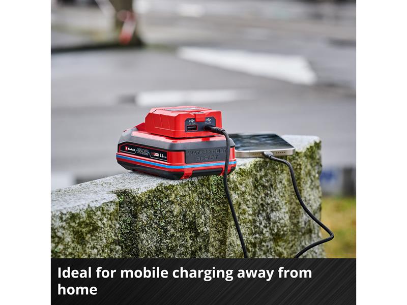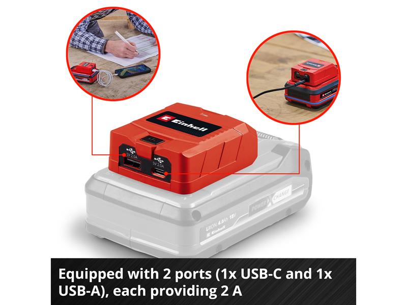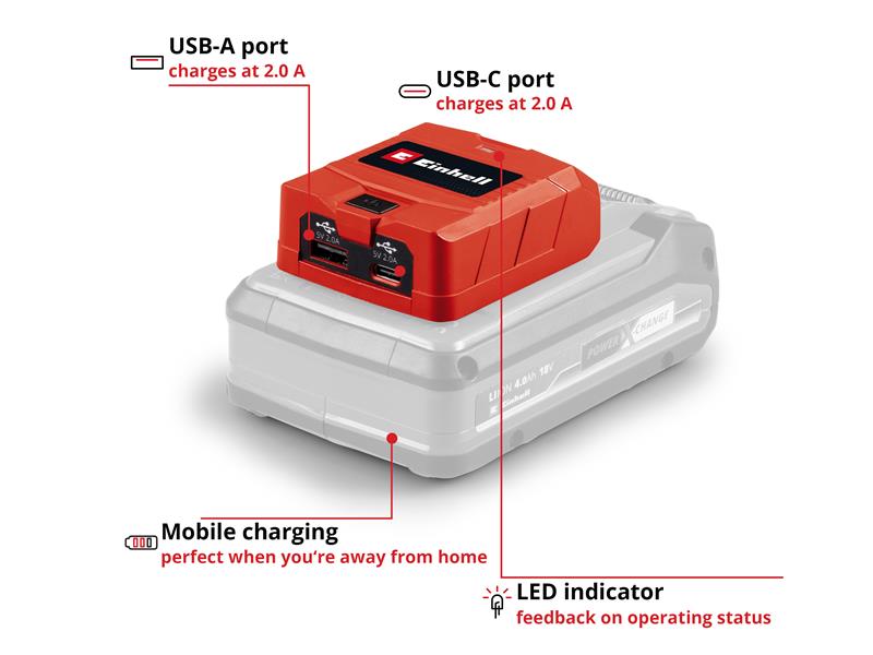 With the EinhellTC-CP 18 Li USB A/C-Solo USB Battery Adaptor and a Power X-Change battery (available separately), you will always have an external power source to hand for mobile devices such as smartphones, tablets and e-book readers. Its two USB ports can be used to charge two devices simultaneously with 2.0 amps each, or to power them with 5 volts.