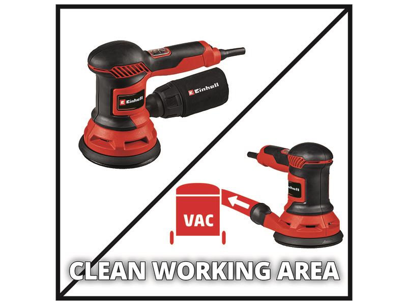 The 425 W TC-RS 425 E is equipped with a 125mm sanding disc with micro hook and loop fastening, so that sandpapers can be changed in seconds and rest against the sanding plate without crumpling. Thanks to the ergonomic grip surfaces with softgrip and the additional handle, comfortable handling is guaranteed even during longer work assignments. For clean, dust-free work, the device has an integrated dust extraction system with dust bag and a 35mm extraction adaptor, to which a wet/dry vacuum cleaner can be connected. The 2-metre-long mains cable offers a large range of action.