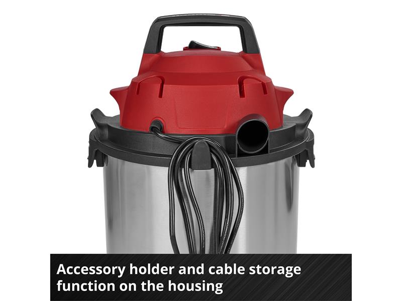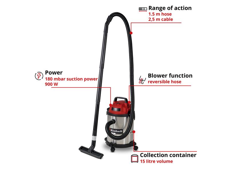 The Einhell TC-VC 1540 S Wet/Dry Vacuum Cleaner is a handy helper for any cleaning work around the workshop and garage. With 900 W of power and 180 mbar suction power, it reliably removes dust, dirt and even liquids from many surfaces. Even hard-to-reach areas can be easily cleaned by using the blow connection.