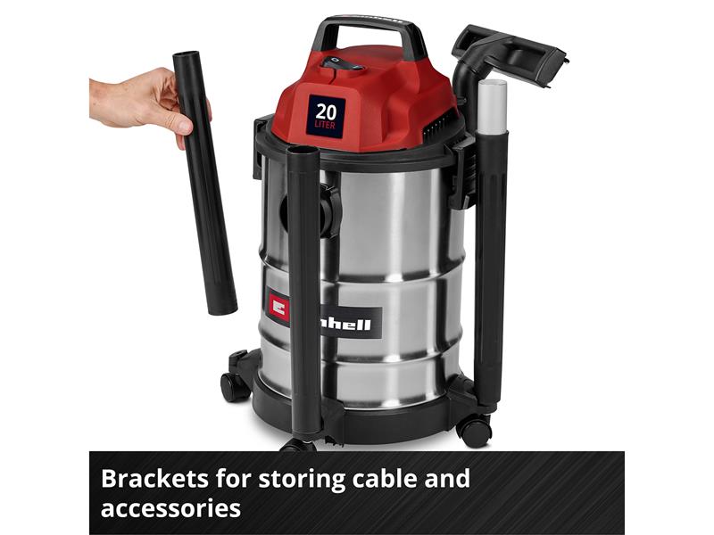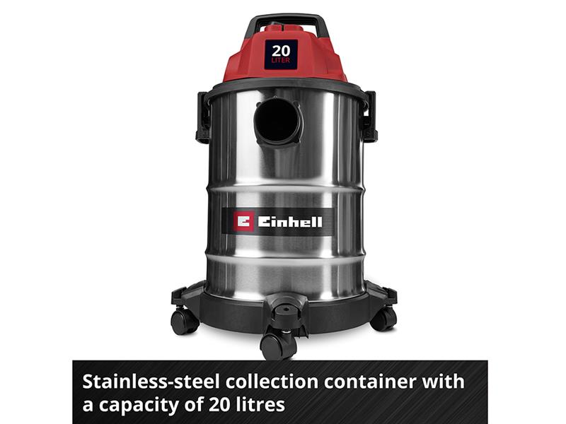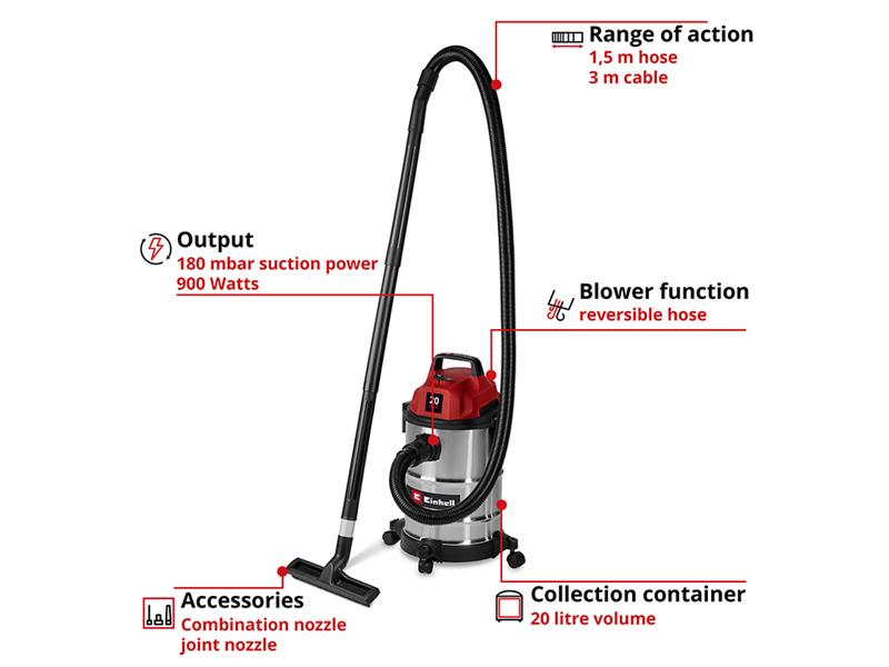 The Einhell TC-VC 2045 S Wet/Dry Vacuum Cleaner is perfectly suited for thorough cleaning around the house, workshop and garage. With 900 W of power and a suction capacity of 180 mbar, it reliably removes dust, dirt and liquids from a wide variety of surfaces. Even hard-to-reach areas can be easily cleaned when using the blowing connection.