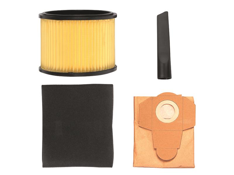 Supplied with: 1 x Suction Hose 36mm x 2.5m, 2 x Extension Pipes, 1 x Crevice Nozzle, 1 x Combination Nozzle, 1 x Foam Filter, 1 x Paper Dirt Collection Bag and 1 x Pleated Filter.