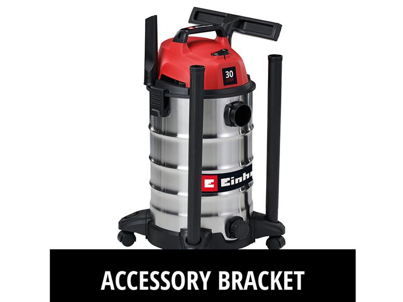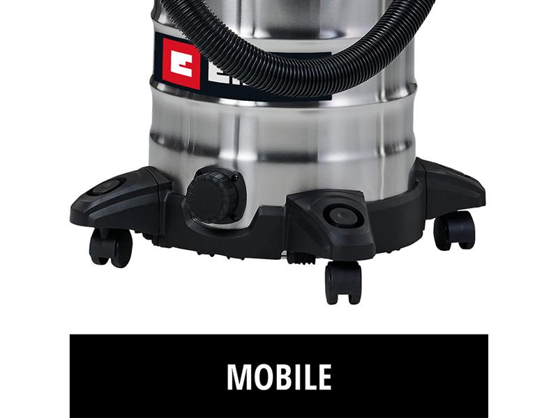 The Einhell TC-VC 3055 S Wet/Dry Vacuum Cleaner is ideal for thorough cleaning with its suction power of 190 mbar. With an energy consumption of 950 watts, it effortlessly removes dust, dirt, and liquids. Equipped with a 15 litre stainless steel container, 2.5m long plastic suction hose (Ø 36mm) and a 2-piece plastic suction pipe. The 3m power cable can be neatly wound onto the cable holder for storage. Four wheels and a carrying handle ensure easy mobility.