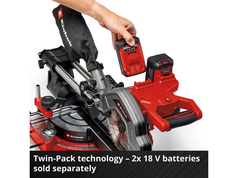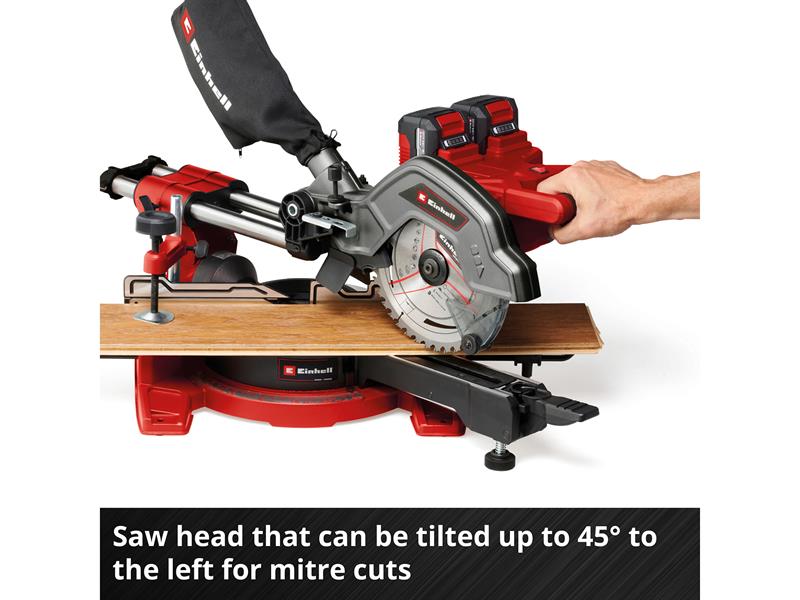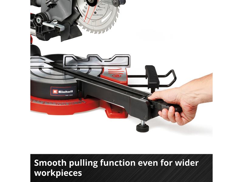 The Einhell TE-SM 36/8 L Li-Solo Sliding Mitre Saw has a powerful 36V motor and with an idle speed of 3,000 rpm, the robust 40-tooth, Ø 216mm carbide-tipped saw blade works quickly and cleanly through the material. The rugged saw has a smooth sliding function for wide workpieces. This enables a cutting width of max. 305mm and a cutting depth of max. 65mm.