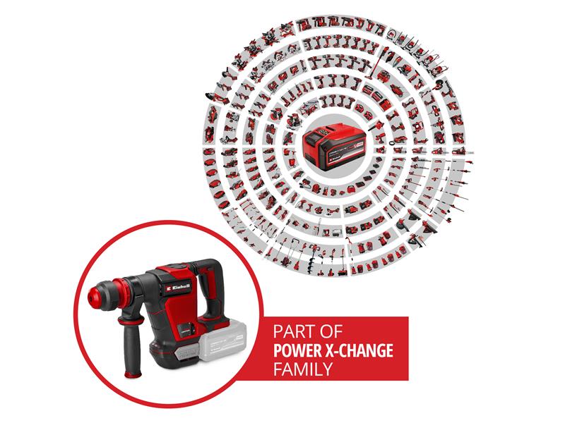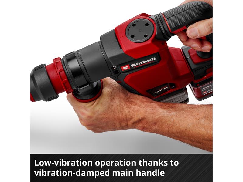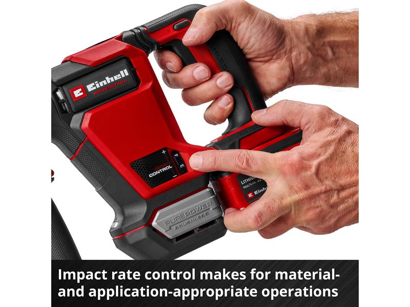 Powered by an Einhell brushless motor. This brushless motor provides more power and longer running times than a conventional carbon brush motor. Once you register online, there is a 10-year warranty on the brushless motor. In order to perfectly adapt the performance to the respective task, the cordless demolition hammer is equipped with a dial for variable control of the impact rate. Integrated constant electronics ensure precise performance at all times, even with high loads.