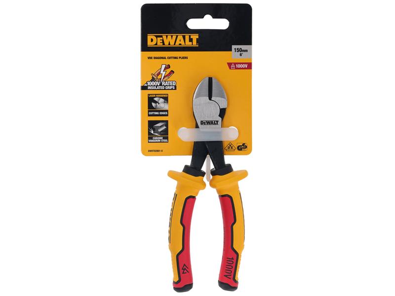 DEWALT VDE Diagonal Cutting Pliers feature a laser hardened cutting and gripping edge that provides maximum strength, but also reduces low hardness in damage prone areas on your fixings. Approx. hardness 61±2 HRc and depth is 1.5±0.5mm. The high leverage design increased jaw force. A black oxide trim extends lifespan.