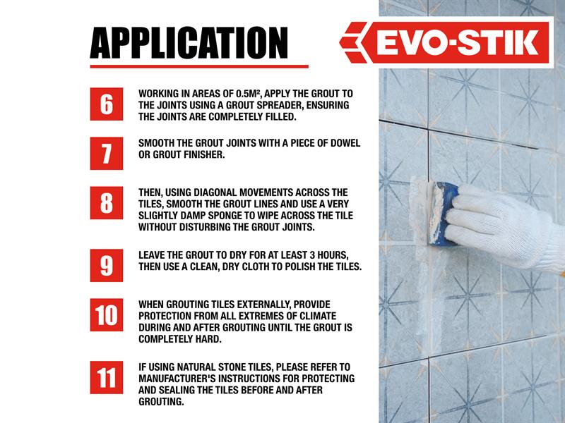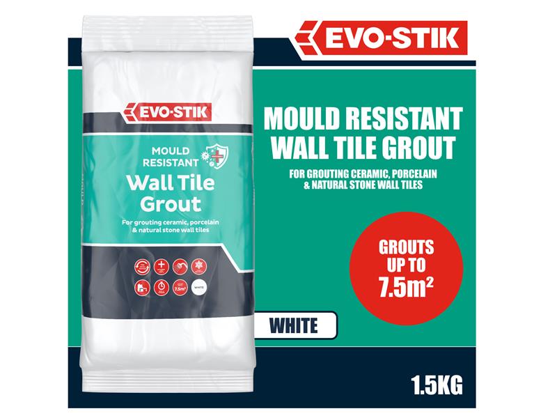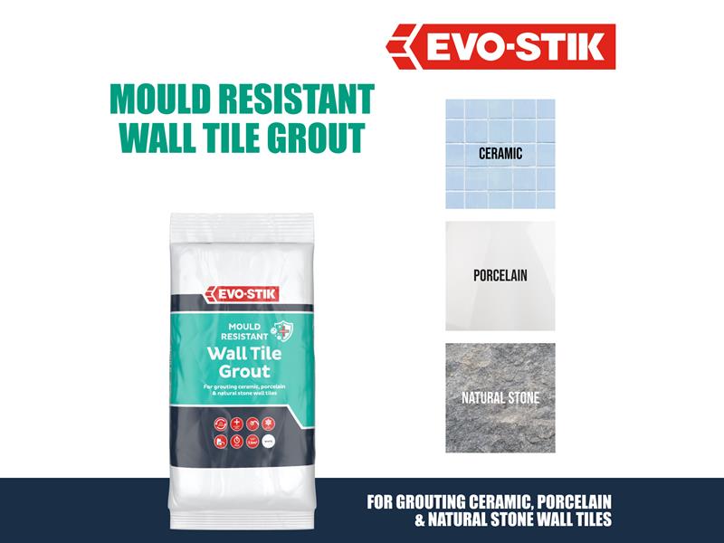 Evo-Stik Wall Tile Grout Mould Resistant is a fast setting cement-based grout, suitable for finishing joints of internal and external ceramic tile installations. When set, it is completely waterproof and will not wash out of joints, making it ideal for use in areas subject to frequent wetting and condensation such as power showers, kitchens and bathrooms.