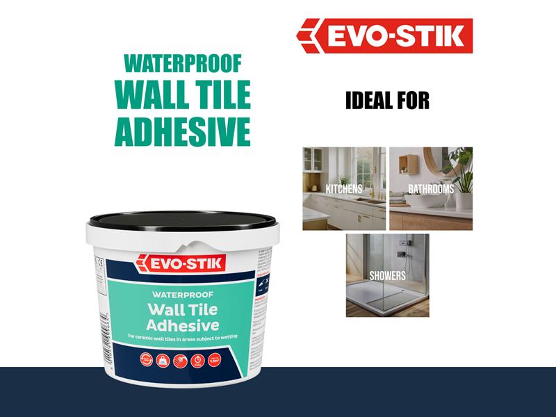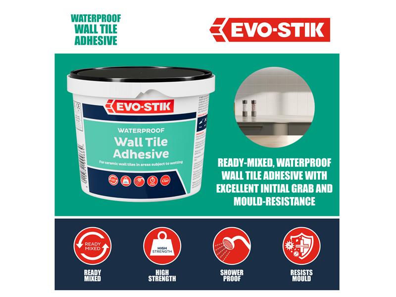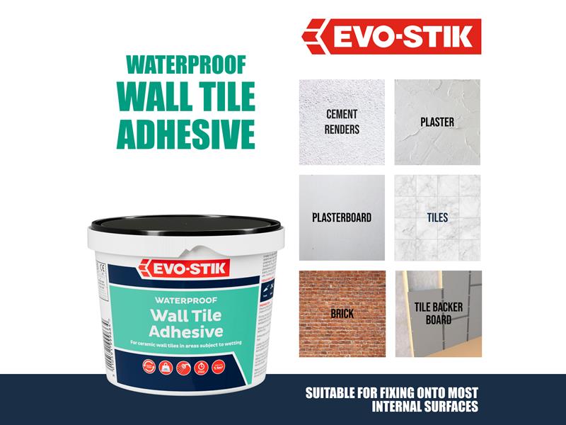 The Evo-Stik Waterproof Wall Tile Adhesive is ready-mixed, easy to use and suitable for fixing ceramic tiles onto most interior walls and backgrounds, including cement rendering, plaster, plywood, plasterboard, blockboard, wood chipboard, old glazed tiles, glazed bricks and painted surfaces.