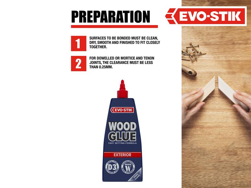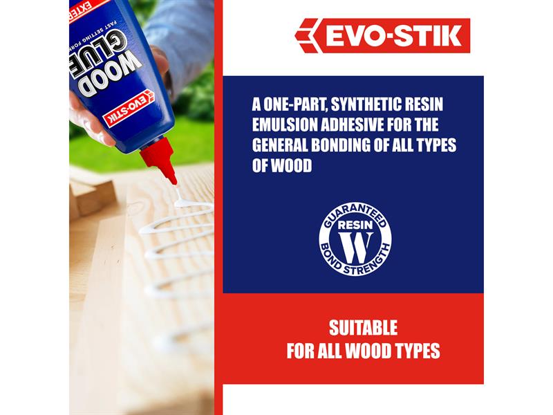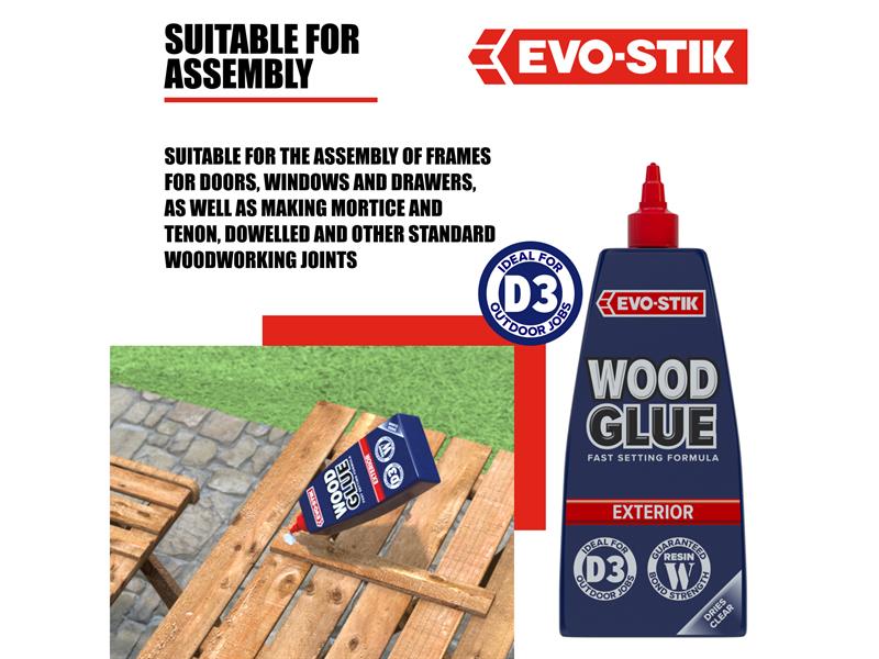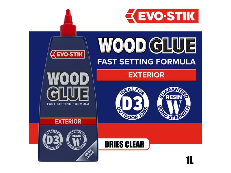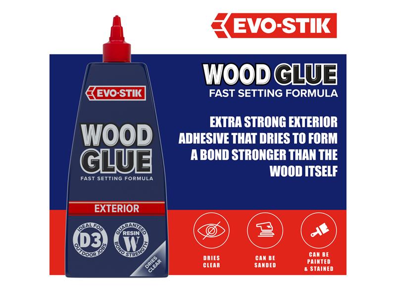 EVO-STIK Wood Glue Exterior is fast setting, extra strong and weatherproof, complies with EN 204 Type D3. Suitable for interior or exterior use and dries to form a bond stronger than the wood itself. Dries to a clear finish that can be sanded, painted or stained. The anti-roll bottle has a no mess, clog-free nozzle and twist to seal cap.