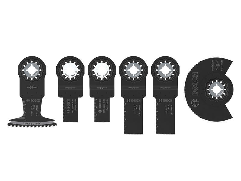 Bosch 6 Piece Wood & Soft Metal Set for professionals in various trades who want to make plunge cuts in wood and soft metal, using their multitools. The Starlock Snap-In mounting system allows fast blade removal and exchange within 3 seconds without having to touch the blade. The mounting system produces the highest power transfer thanks to a 3-dimensional tight-fitting connection between machine and accessory.